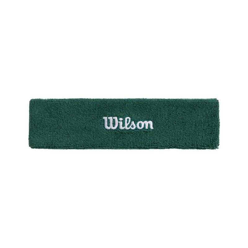 Wilson présente son bandeau éponge vert, subtilement signé du logo Wilson en blanc au centre, offrant un contraste élégant et reconnaissable.