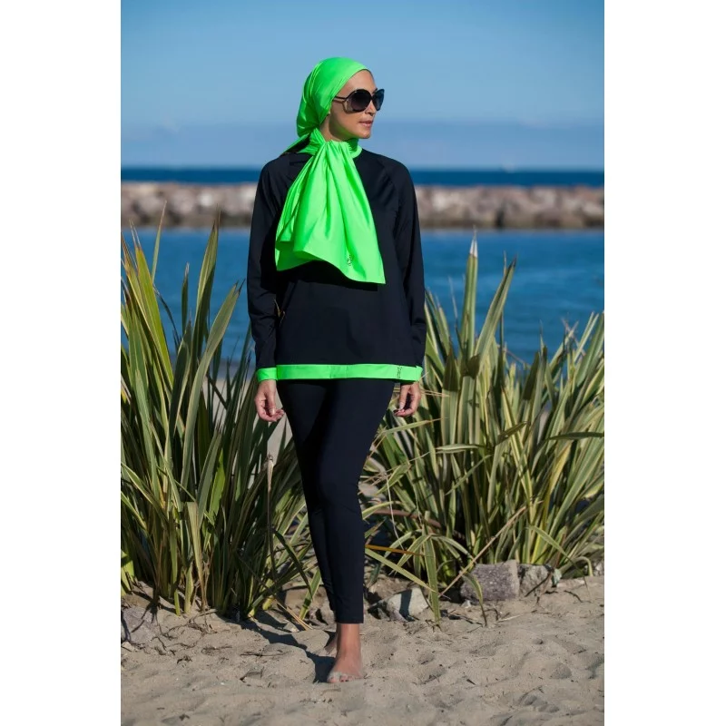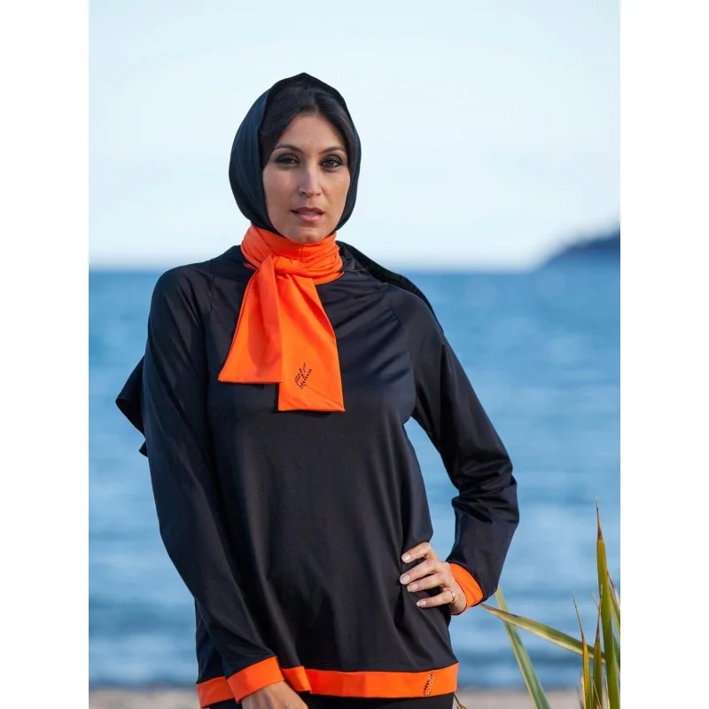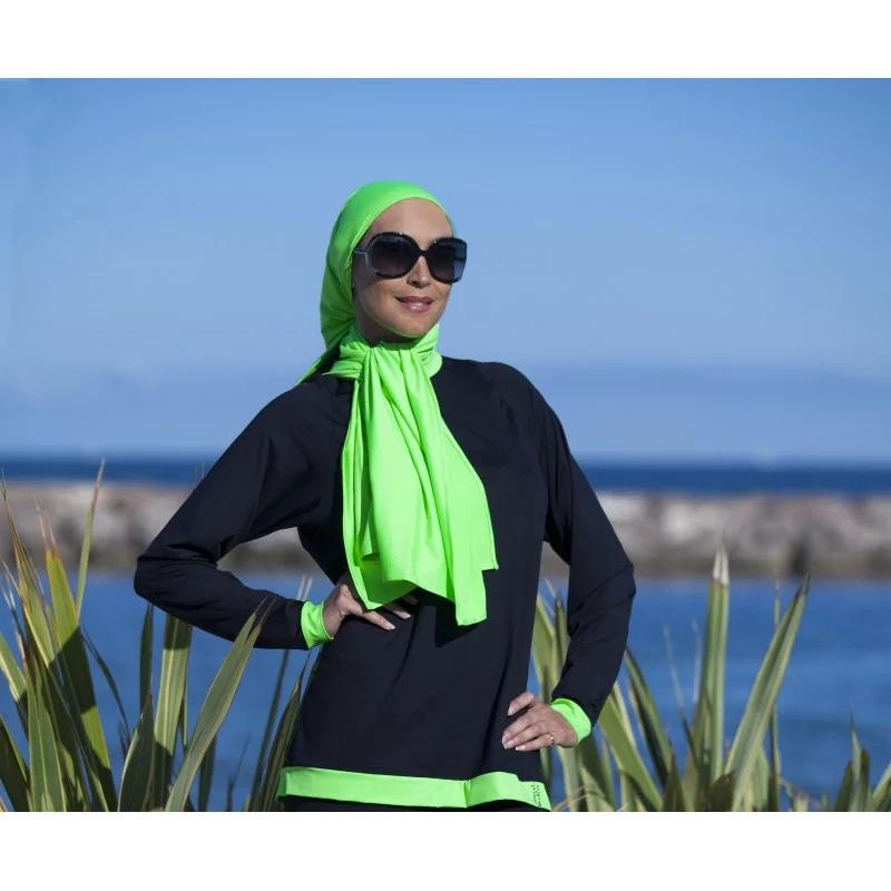 Burkini Lorie Caractéristique du produit : Longueur tunique : 75 cm Composition : 80% polyamide / 20% Elasthanne Motif : Bicolore Fluo noir/vert ou noir/orange Fabrication : Française Produit disponible en stock Livraison sour 48 heures