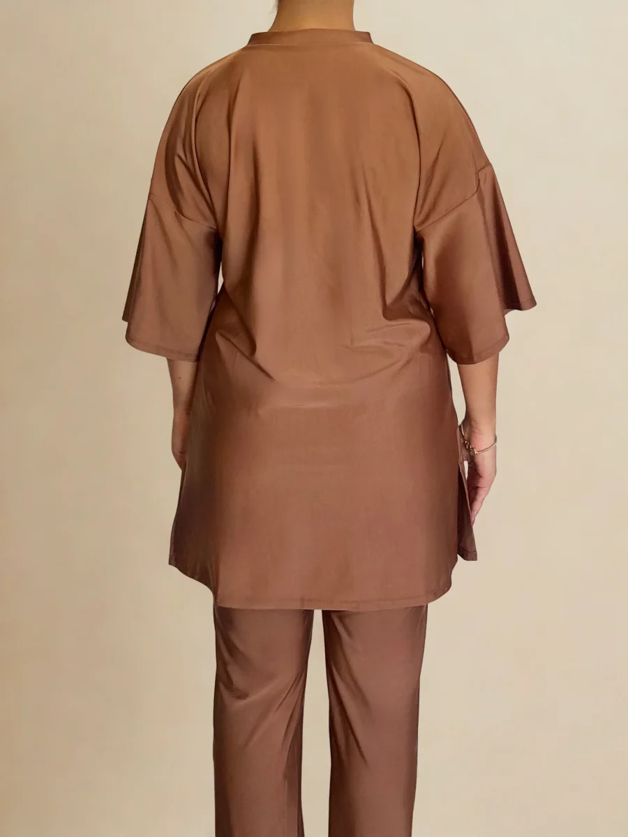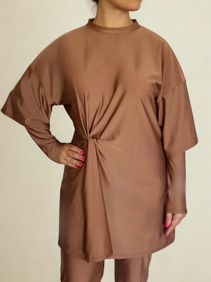 Burkini Siwa Caractéristique du produit : Longueur tunique : 89 cm Composition : 85% polyamide / 15 % Elasthanne Couleur : Marron / Sable Produit disponible en stock