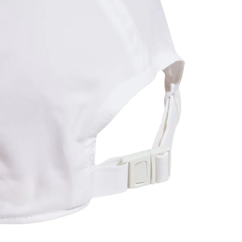 Toute blanche, cette casquette se distingue par quelques détails noirs, tels que le logo Adidas et un liseré noir au niveau de la visière.
