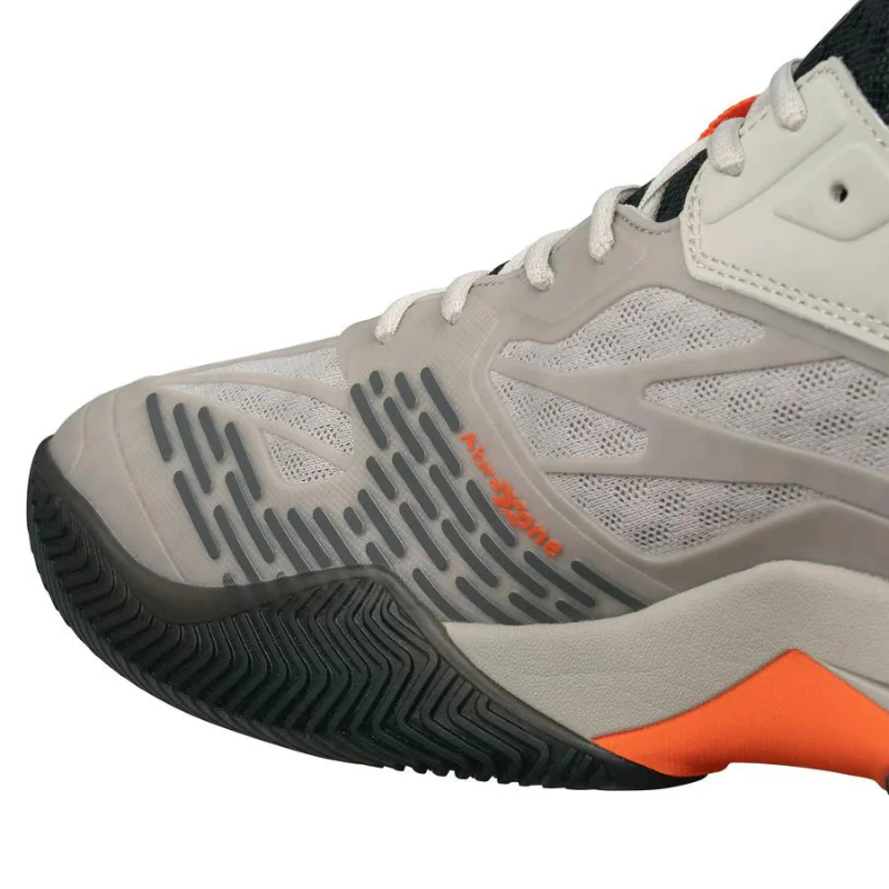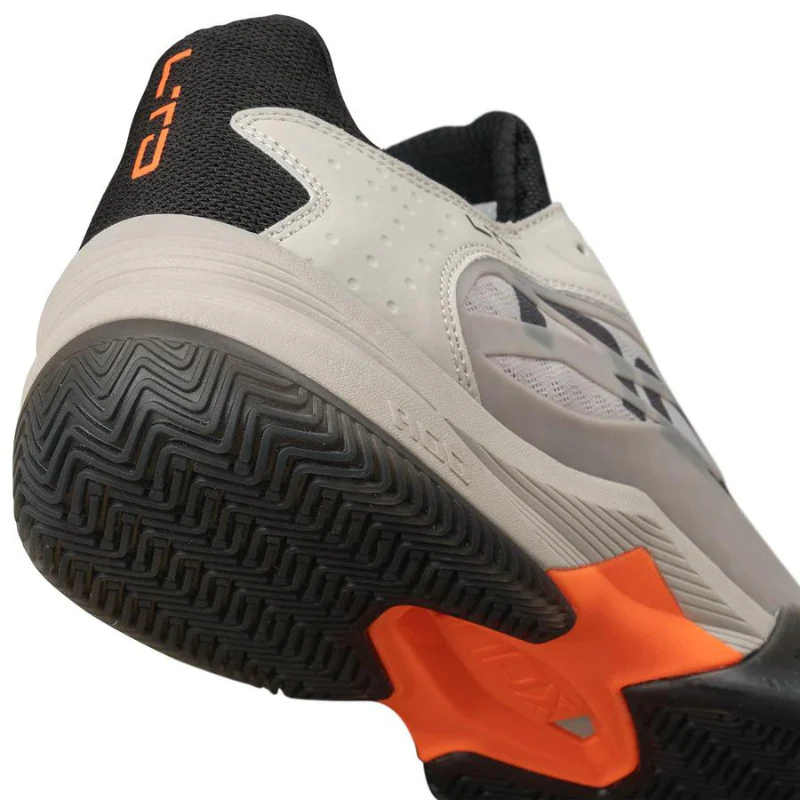 Ces chaussures offrent un design moderne et élégant, combinant des couleurs neutres comme le gris et le blanc avec des accents orange vifs pour un look dynamique et énergique sur le terrain.