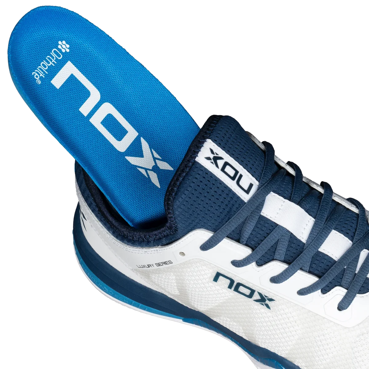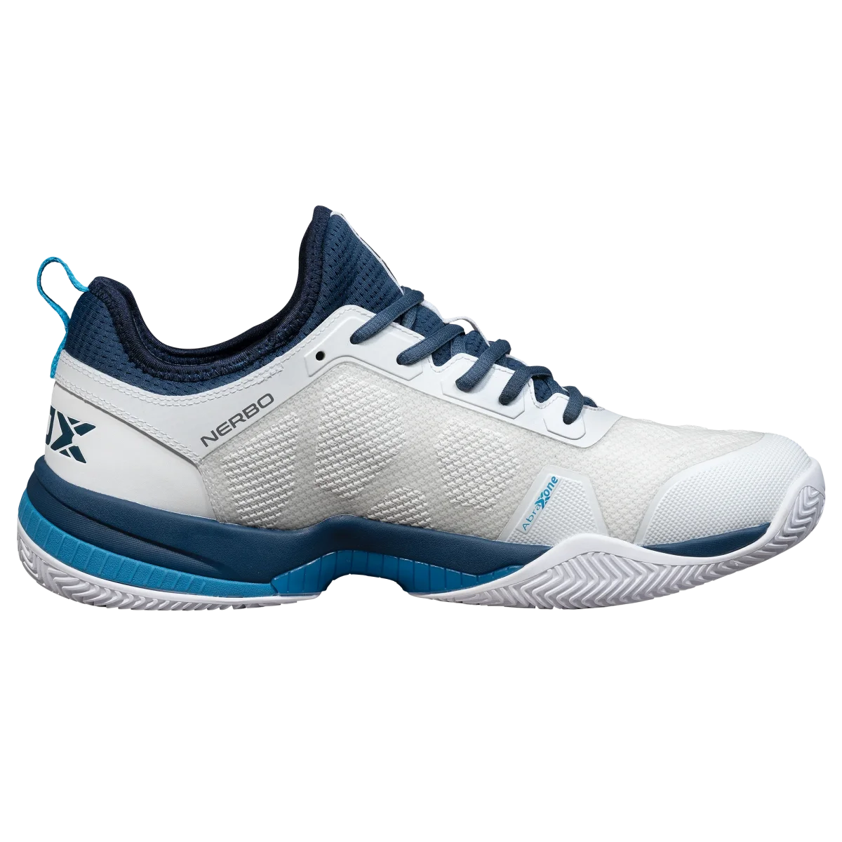 Voici les chaussures de padel pour hommes Nox Nerbo de couleur blanche et bleue, pour un look imparable sur le court ou en dehors.