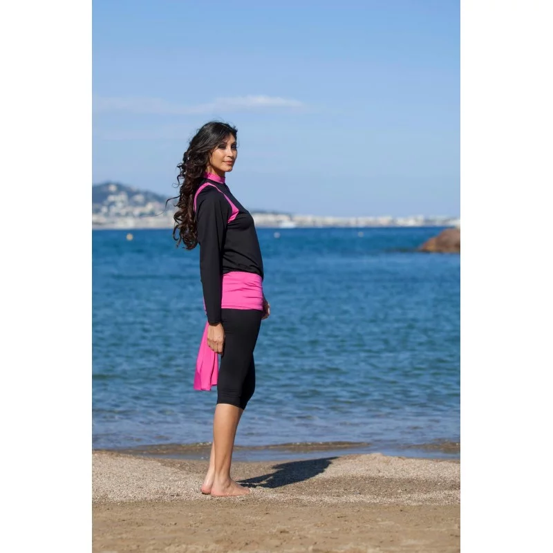 En effet, nous sélectionnons pour vous, Mesdames, un tissu de haute qualité, made in Italie, avec une protection anti-U-V, un séchage rapide. Pour la confection nous avons privilégié une fabrication française. Notre priorité est le bien-être de nos chères clientes lors d’activités aquatiques ou sportives. Cette référence est la garantie de nos produits. Aussi, un choix de différentes couleurs vous est proposé marine, fushia et noir. Ainsi, vous pourrez  marier facilement votre cycliste à la tunique et au bonnet de bain pour burkini que vous souhaitez. Vous  pourrez trouver ces articles dans notre rubrique balnéaire.