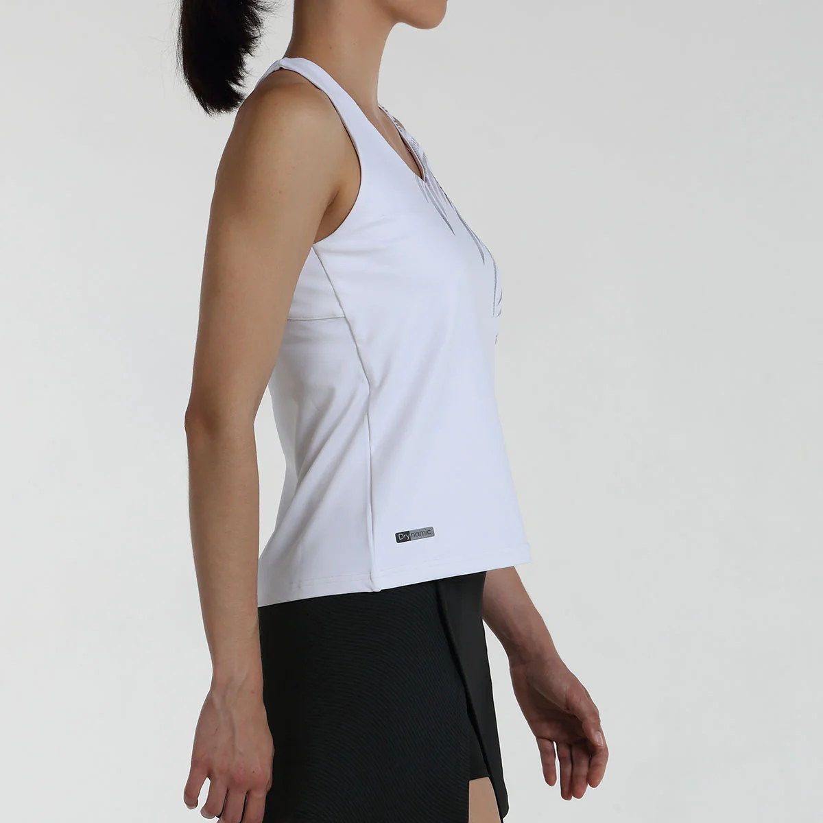 De couleur blanche, profitez de ce débardeur au motif rayé et moderne pour vous illustrer sur les courts.
