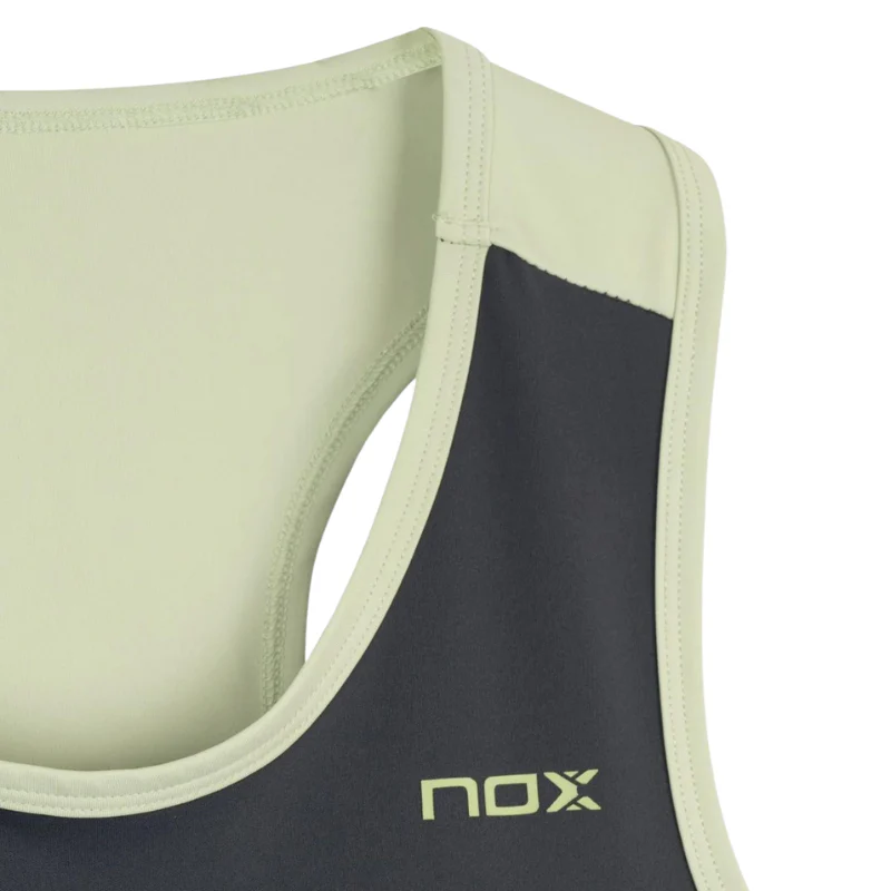 Ce débardeur arbore un design élégant en gris, agrémenté de détails vert clair sur les bretelles et le dos, ainsi que du logo NOX sur la poitrine.