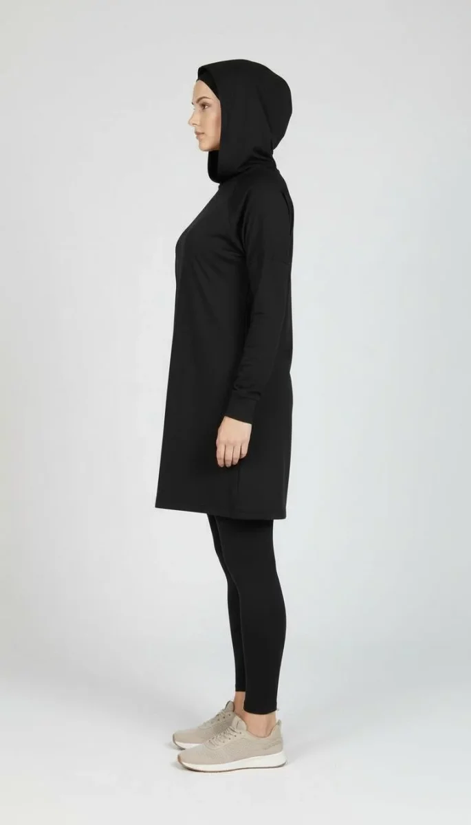 Cette tunique longue de sport a été spécialement développée pour répondre aux besoins des femmes adeptes de la mode modeste et du vêtement pudique. Sa longueur couvrante, ses manches longues et son col couvrant assurent une tenue adaptée aussi bien à la pratique sportive qu’à un usage quotidien.