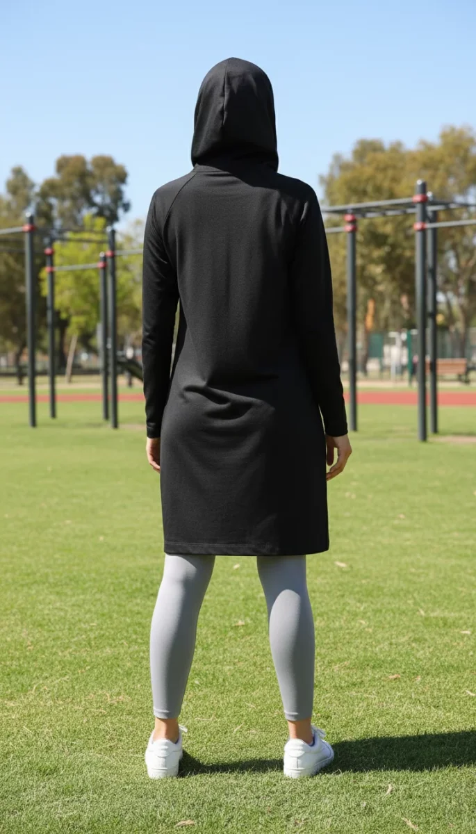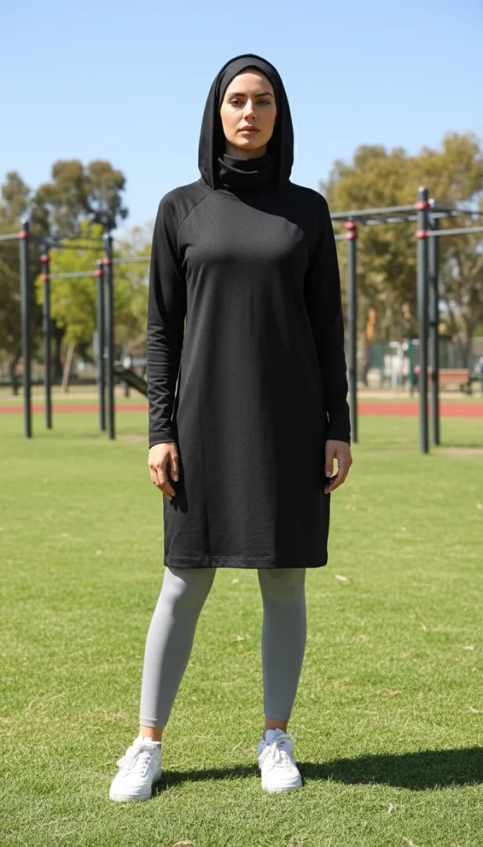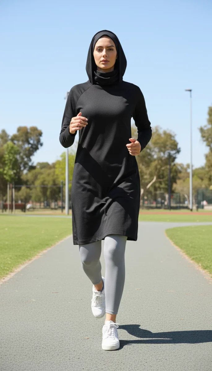 Tunique de sport modeste Caractéristiques du produit : Matière : tissu technique confortable et extensible Composition : 88 % polyester / 12 % élasthanne Coupe : tunique longue, couvrante, adaptée à la mode modeste Col : col couvrant pour un maintien optimal Coloris disponibles : Noir Tailles disponibles : S – M – L Utilisation : sport, marche, activités quotidiennes Livraison : sous 48 heures