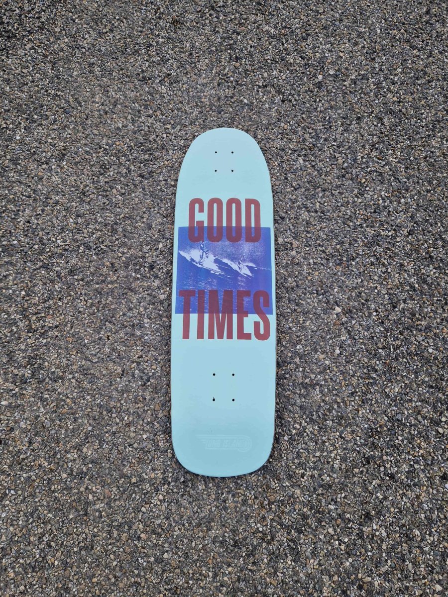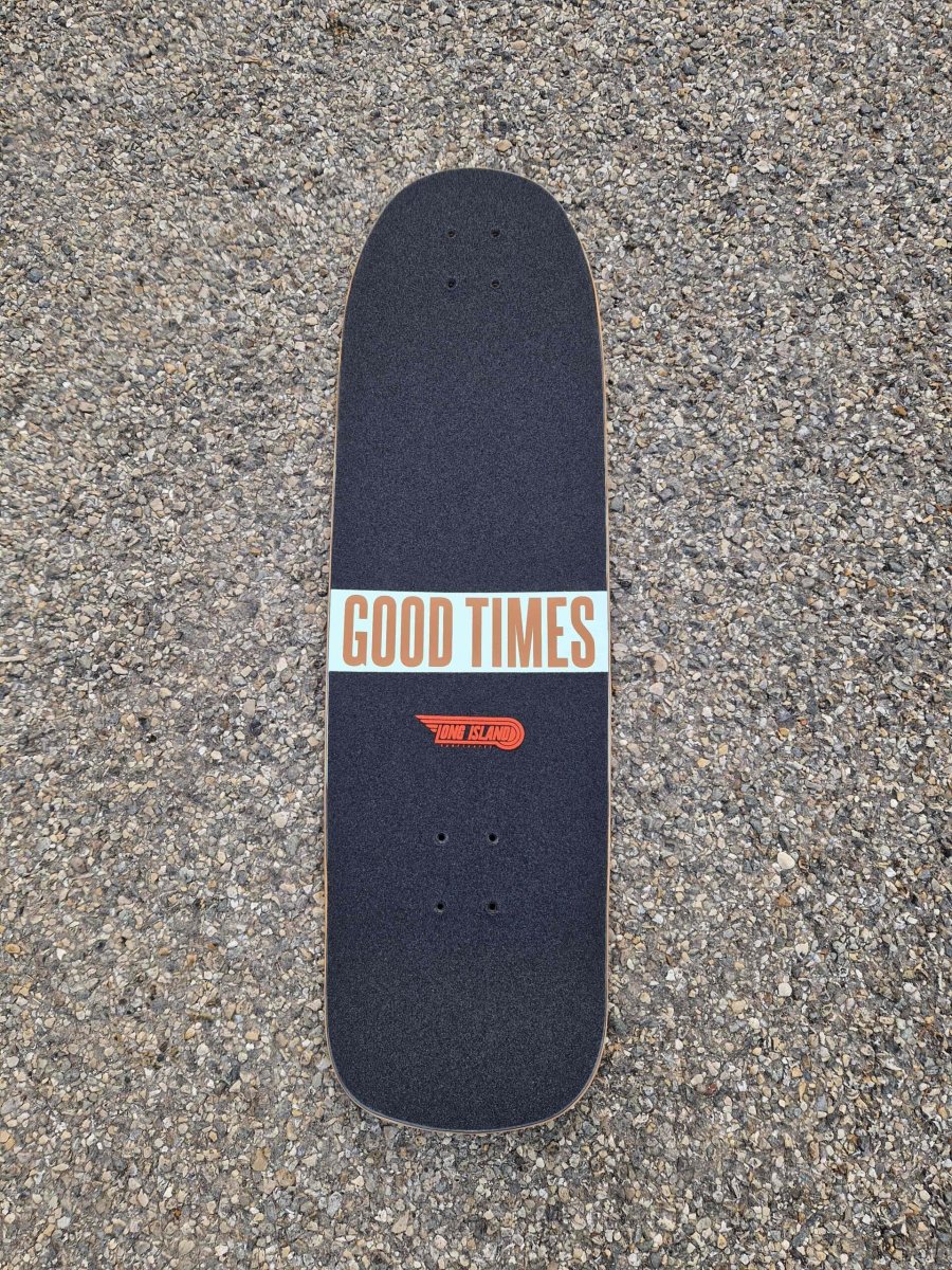 Planche Long Island Good times dont les trucks ont Ă©tĂ© dĂ©montĂ©s pour ĂŞtre vendus sĂ©parĂ©ment. Planche qui n’a jamais servie.