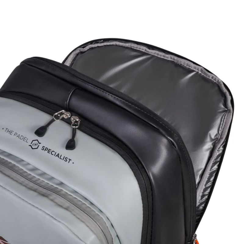 A l’intérieur, un grand compartiment principal permet de ranger tout votre matériel. Il dispose également d’un compartiment rembourré pouvant accueillir vos raquettes en toute sécurité et les protéger des chocs.