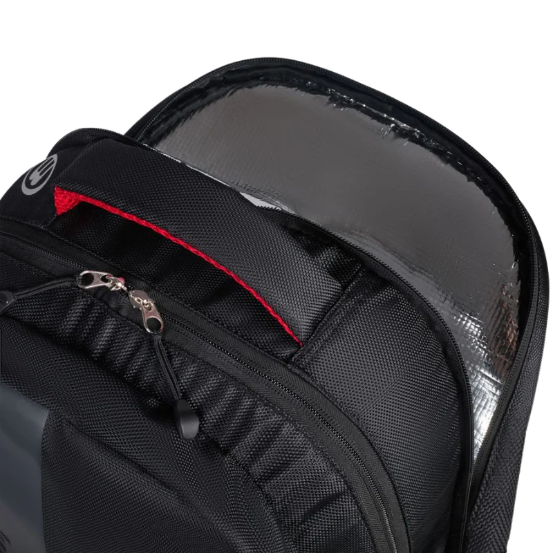 Il dispose d’un grand compartiment principal pour ranger tout votre matériel quotidien, ainsi que d’un compartiment rembourré pouvant accueillir vos raquettes en toute sécurité et les protéger des chocs et des variations de température.