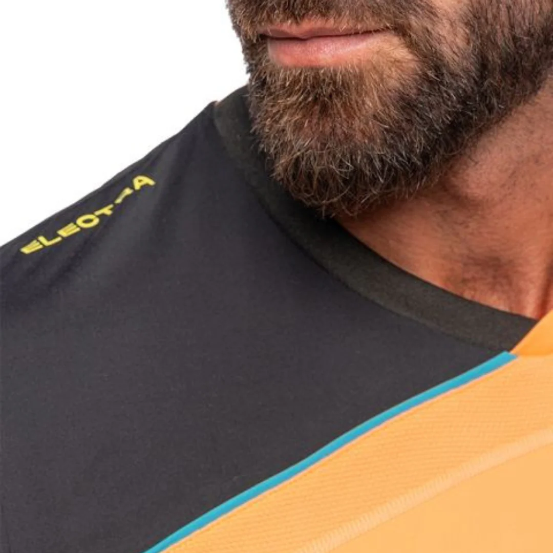 D’une belle couleur orange, ce t-shirt est sublimé par des touches noires et vertes du plus bel effet.