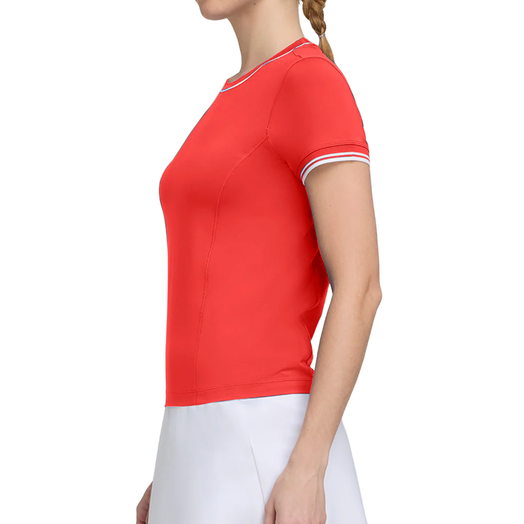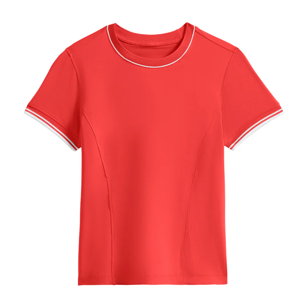 Affichant une teinte rouge élégante rehaussée de délicats liserés blancs, ce t-shirt séduit par son style sobre et raffiné.