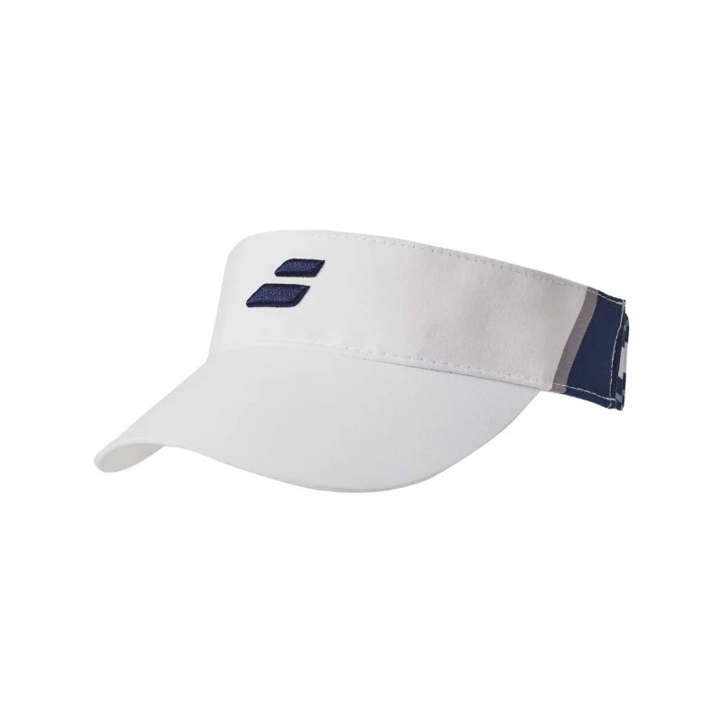 De couleur blanche, cette visière arbore simplement le logo Babolat en broderie bleu foncé.